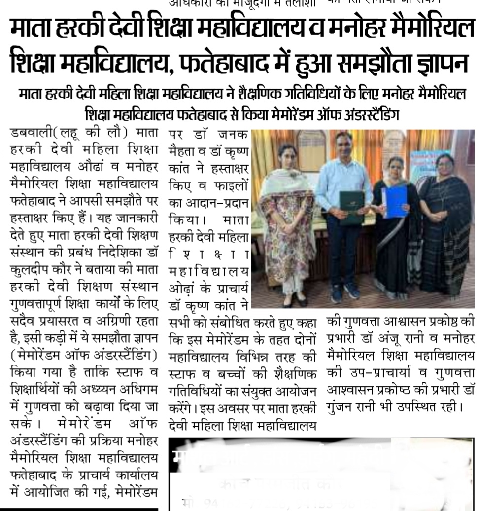 MOU With Manohar Memorial College of Education, Fatehabad ( April,2026)